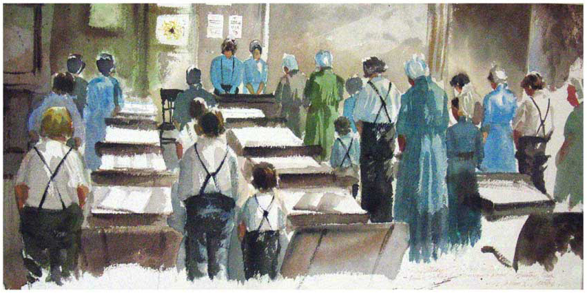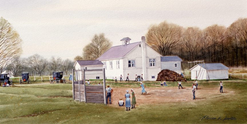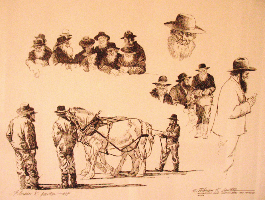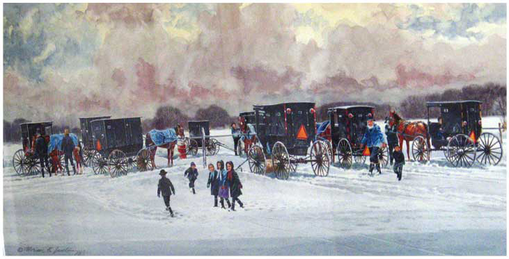 The artist created this painting in 1984, it represents the English influence on the Amish culture here in America